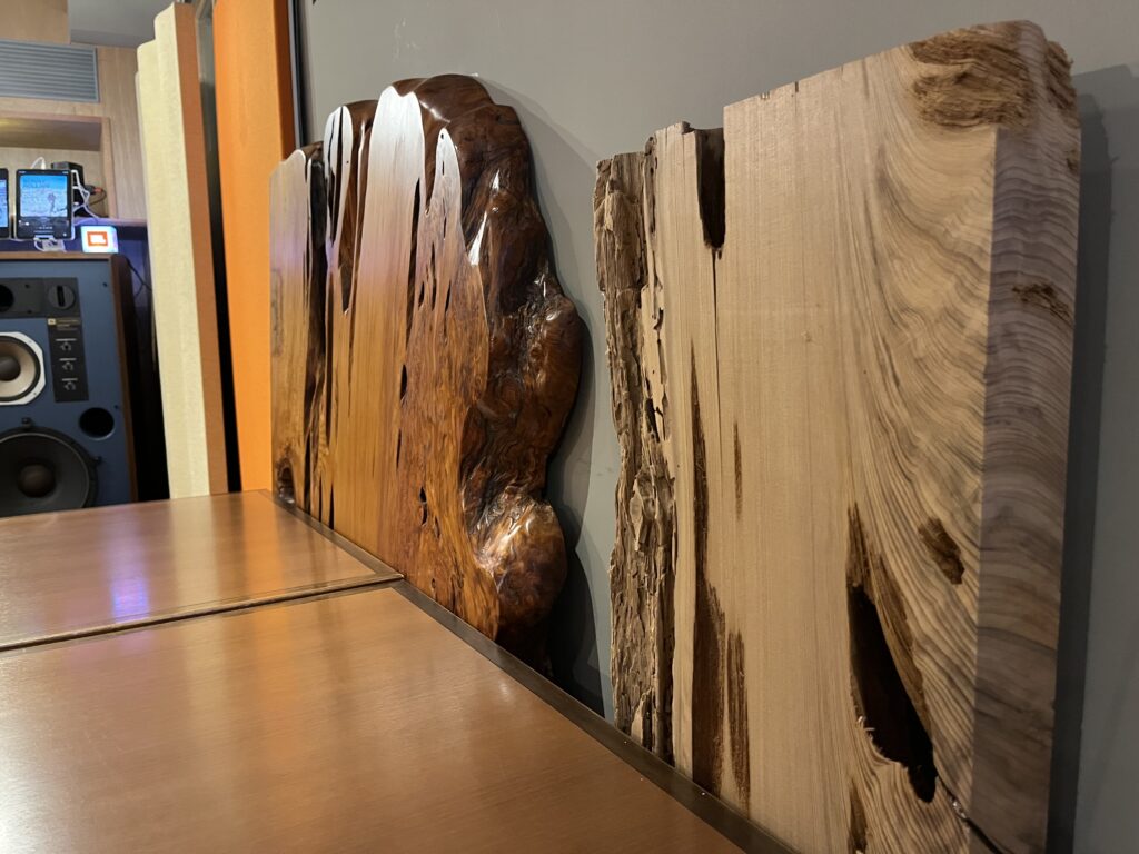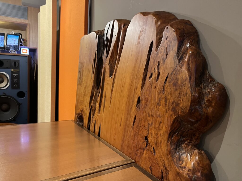 世界自然遺産が音響材として活用されるのは、世界でも当店だけと自負します。樹齢2000年の特大一枚板に反響されるオールドジャズをお楽しみください。また、他ではなかなか見られない光明杢や瘤虎杢と言った屋久杉最高峰の杢もお楽しみください。
