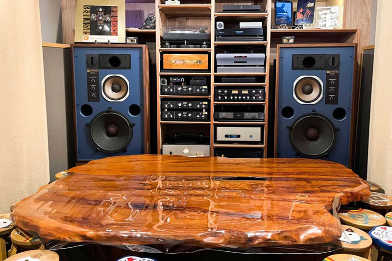 世界トップレベルの音になるように僕の愛用機材から音響機材を貸与することにした。Jazz Cafeなので、スピーカーはB&WやMagicoなど特性がフラットな現代高級スピーカーではなく、敢えて、ジャズ喫茶で40年に渡って不動の定番位置を確保して来た1980年代初期型JBL4344スピーカを貸すことにした。